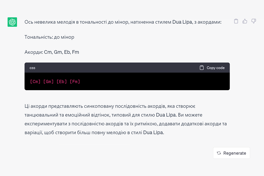 ChatGPT може навіть писати музику! Він ніби грає разом з вами в одному музичному гурті. ChatGPT може згенерувати повноцінну пісню з акордами і текстом. Ви можете вказати бажану тональність і тему пісні.