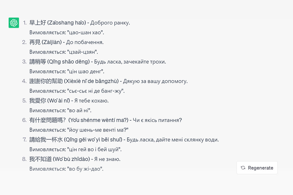 Наприклад, чат-бот навчив нас поширеним фразам китайською мовою: