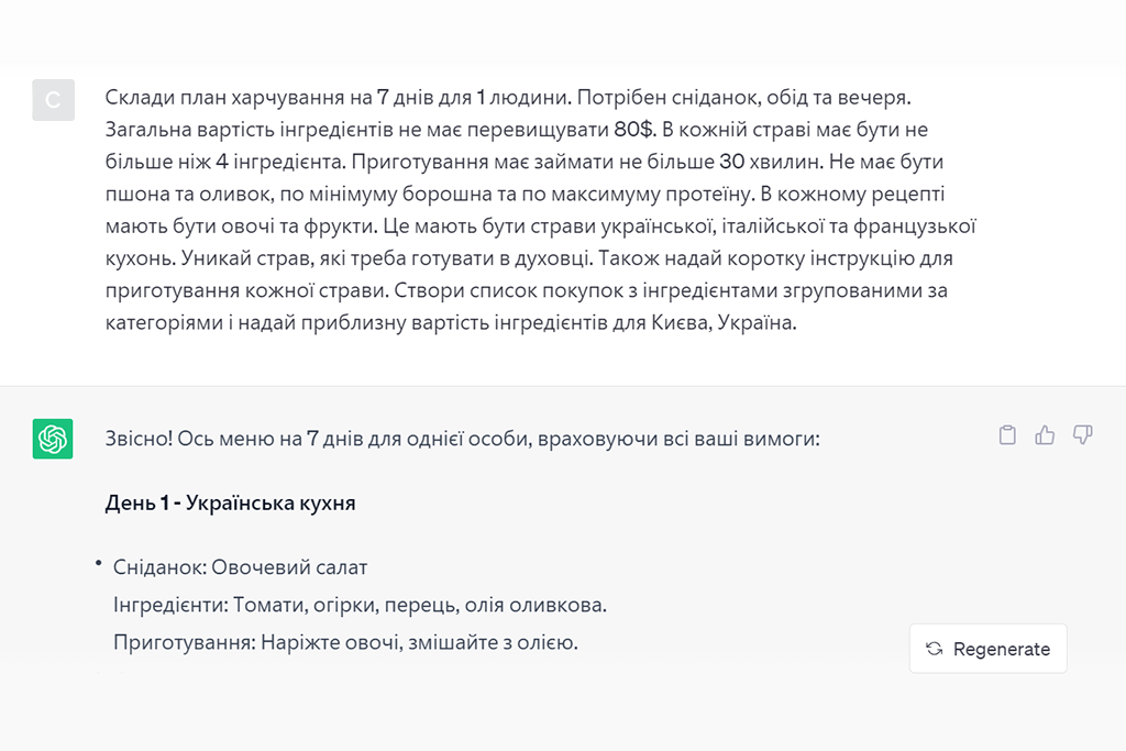 Наприклад, ми попросили ChatGPT скласти тижневий план харчування для українки з рецептами приготування страв. Для цього подали максимально деталізований запит чат-боту, а також вказали свою локацію, оскільки ціни в різних країнах світу відрізняються.