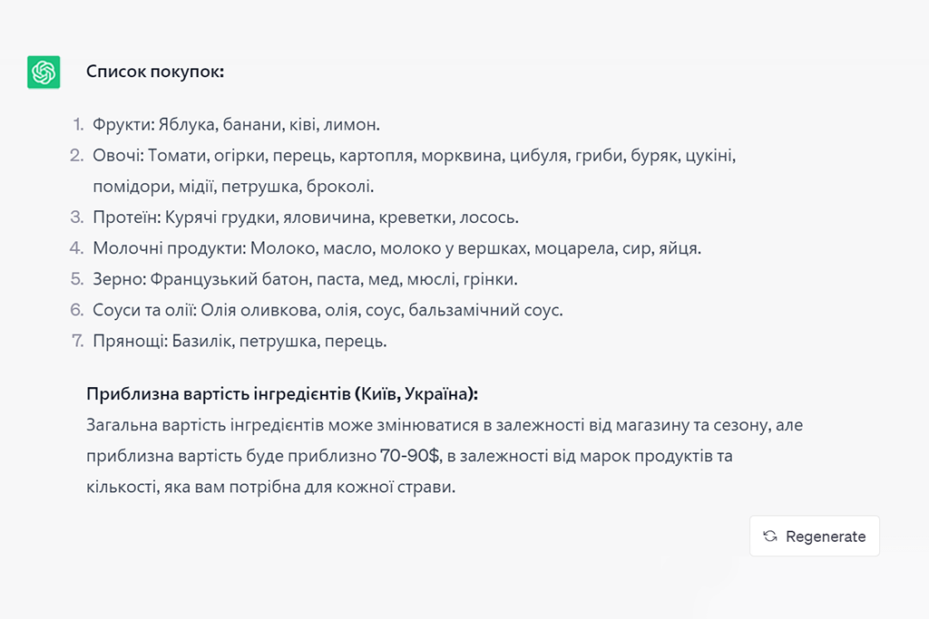 Також ми попросили ChatGPT додати рецепти та список покупок з орієнтовною вартістю.
