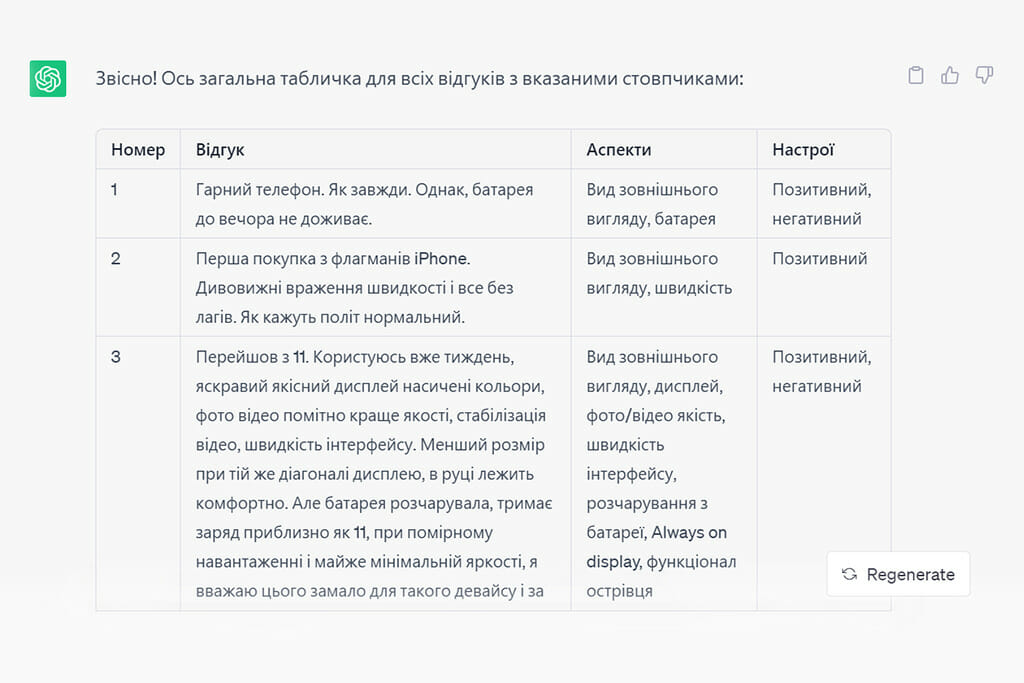 Ми попросили ChatGPT проаналізувати настрої у відгуках про iPhone 14 Pro. Ми просто додали відгук в чат-бот, і отримали оцінку.