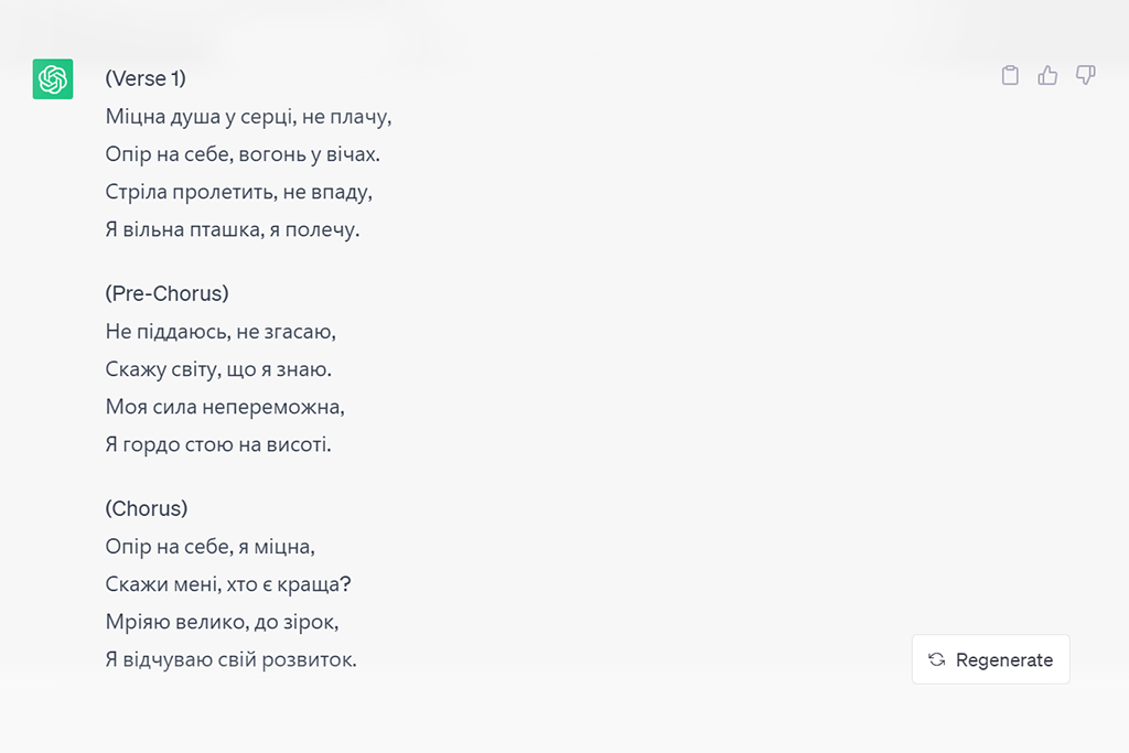 Проте ви можете просити чат працювати над текстом або мелодією, поки вам не сподобається результат. Або ж брейнстормити разом.